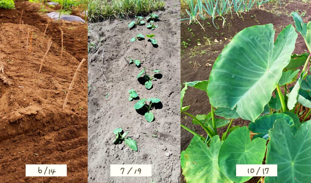 ジャガイモと一緒に4/28に畑に埋めました。芽が出てきたのが7月後半でした。黒マルチを張っておけば良かったなあと思いました。収穫の写真はありませんが11/2に掘ったらしいです。小さいのがいっぱいあって疲れましたが、味は美味しく煮物やお雑煮にして頂きました😋。