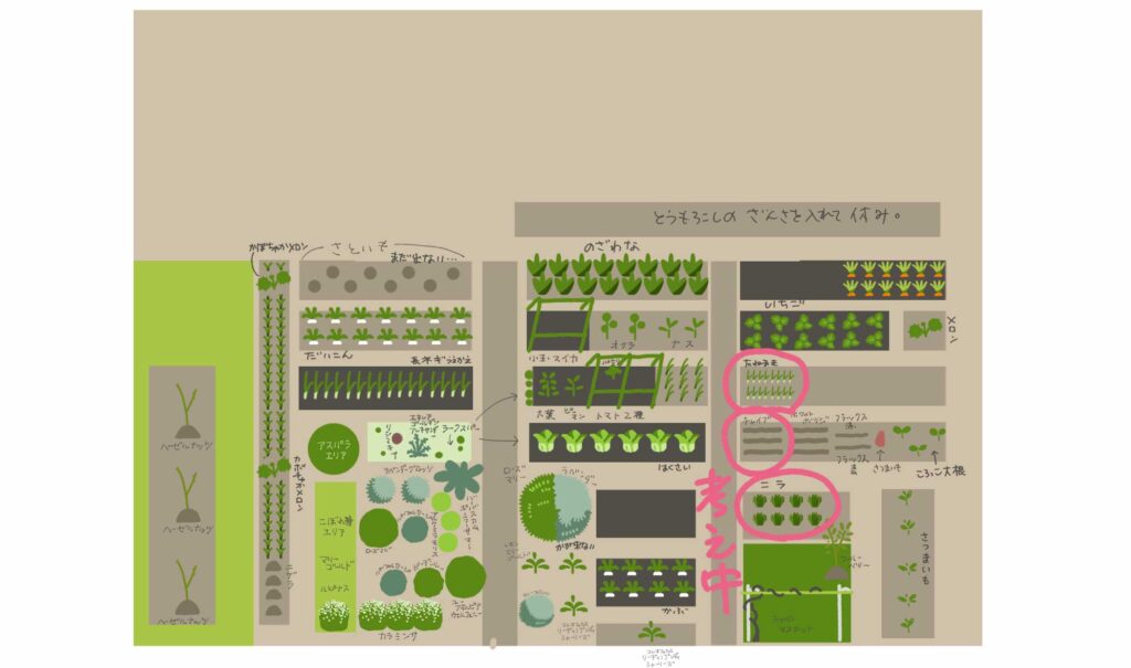 一昨年のいちごはすごい豊作だったのですが、植え替えた去年は全然収穫がありませんでした。まだ苗はそのまま越冬しているので、引き続き様子を見守っていこうと思います。あと、豆類を増やせば団粒構造が何とかかんとかとても畑の状態に良いらしいので、たくさん撒いてみたらいいんじゃないかなと思います。緑肥というのも撒きたいと思います。下は去年の構想ですが実現しているのは半分くらいです。今年もできる範囲で楽しめたらいいなと思います!